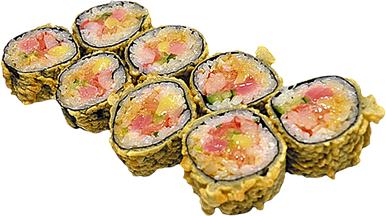 РИС, НОРИ, КРЕВЕТКА, ЛОСОСЬ, СПАЙСИ СОУС, САЛАТ АЙСБЕРГ ▫