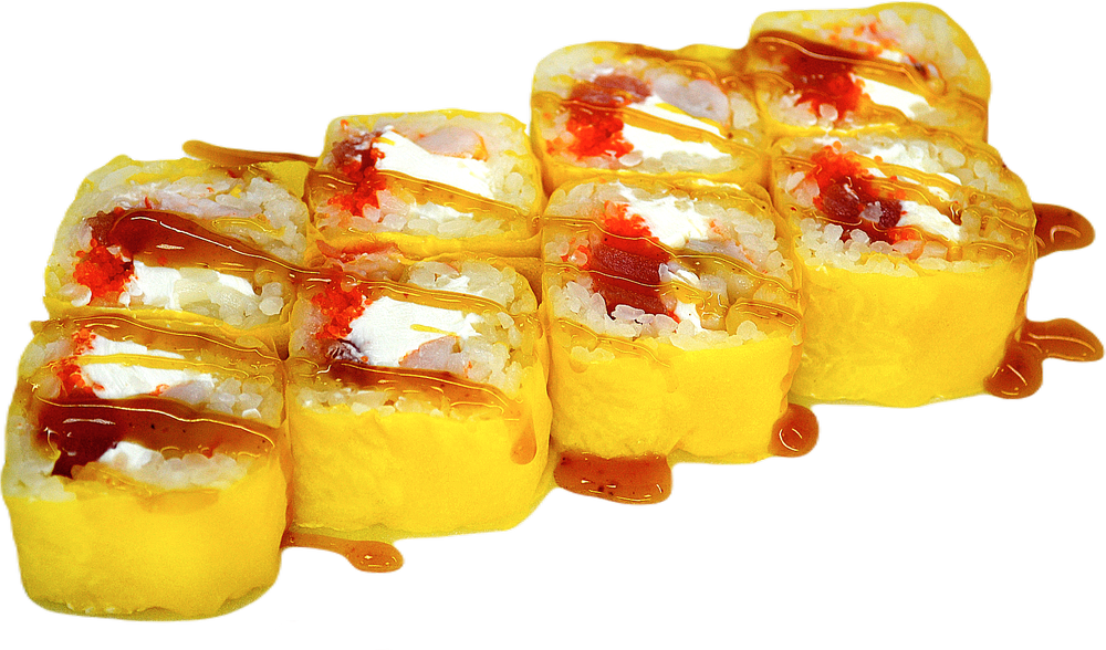 РИС, МАМЕНОРИ, КРЕВЕТКА, ТУНЕЦ, СЫР СЛИВОЧНЫЙ, МАСАГО, СОУС МАНГО-ЧИЛИ ▫