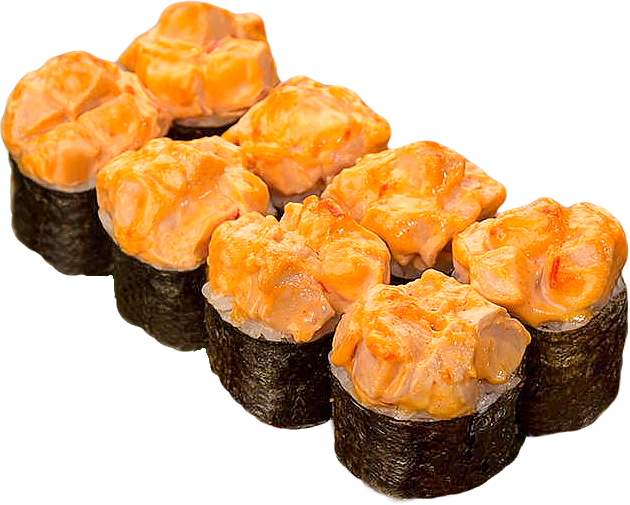 РИС, НОРИ, МОРСКОЙ ОКУНЬ, ОГУРЕЦ, САЛАТ АЙСБЕРГ, СЫР ГАУДА, МАСАГО, СПАЙСИ СОУС ▫